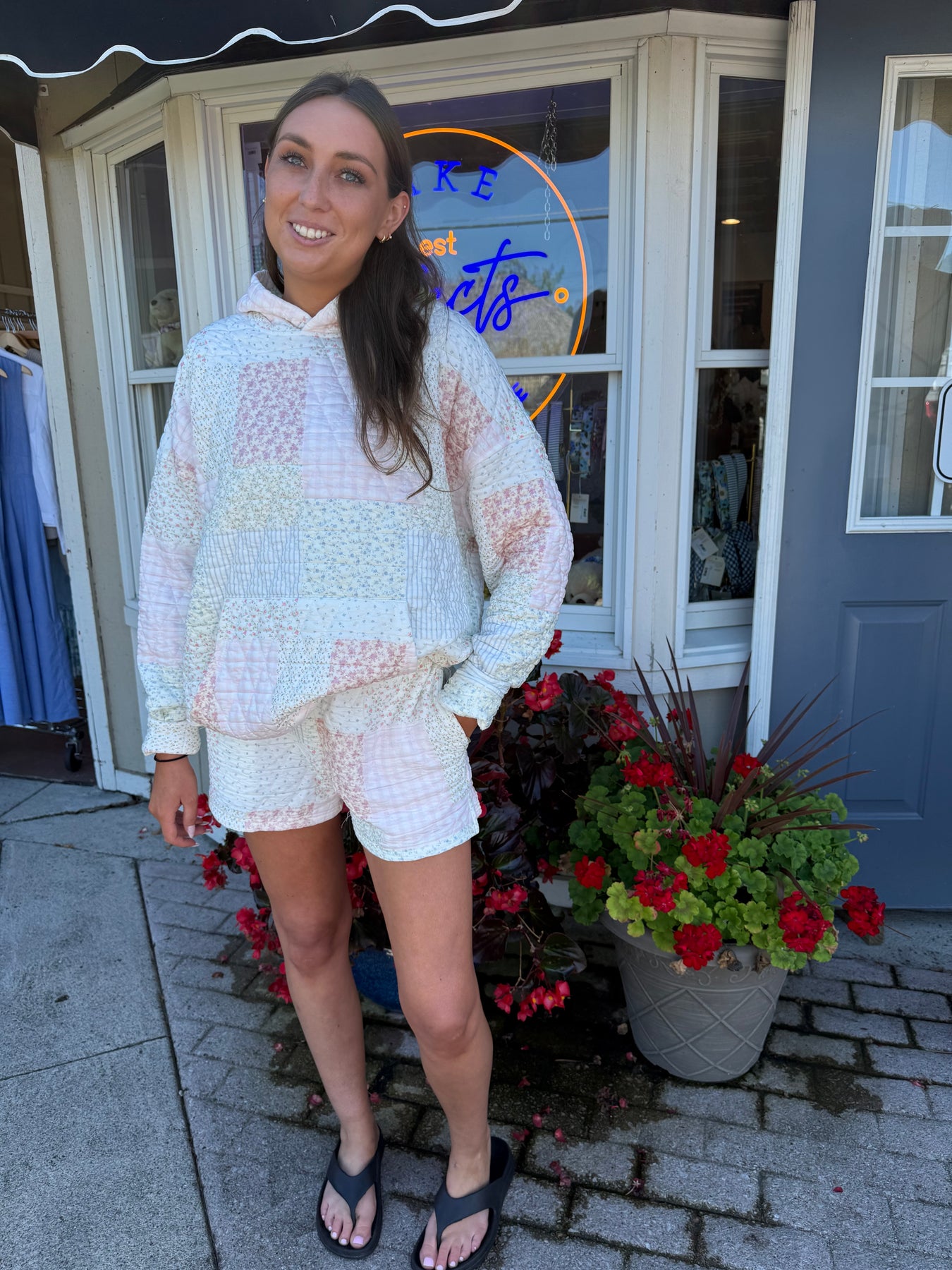 Person wearing quilted hoodie sweatshirt and matching quilted drawstring shorts in pastel pink and blue stripes and floral quilting square patterns.